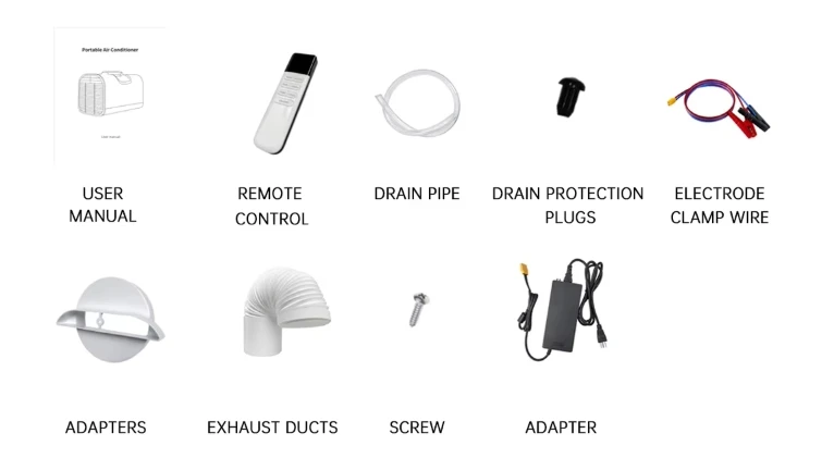 Host / exhaust pipe / drain pipe / adapter / manual / waterproof plug / screw / remote control