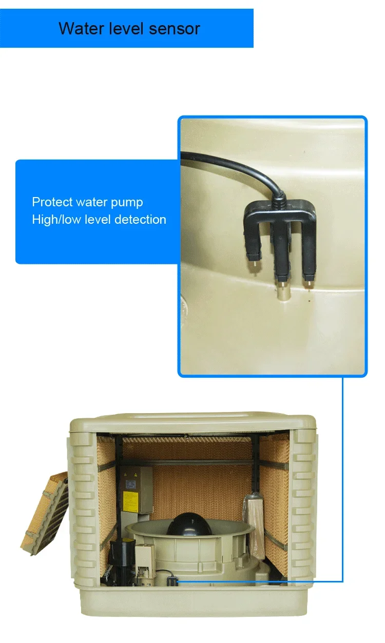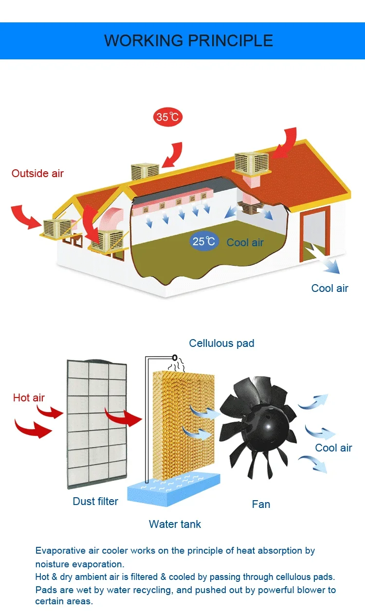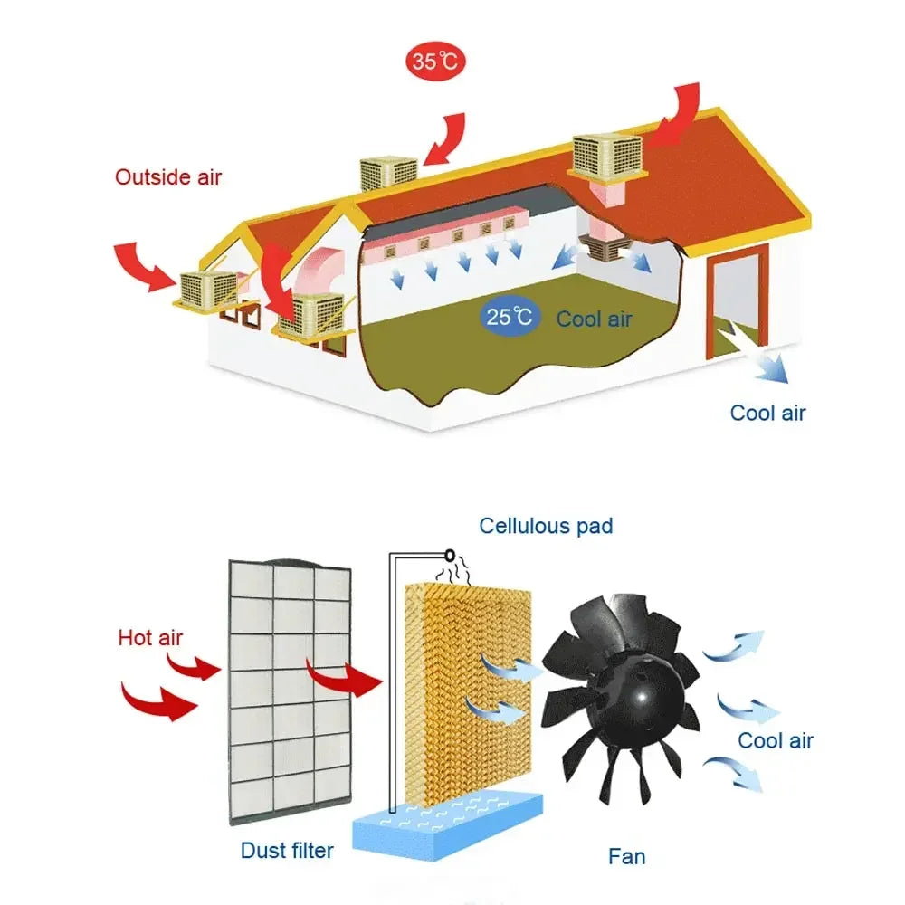 Water air conditioner portable is especially well suited where the air is hot and humidity is low. However, in higher humidity areas there are many proven cost-effective uses for evaporative cooling that make it the right choice, like poultry farm, industrial plants, commercial kitchens, laundries, dry cleaners, greenhouses, spot cooling, etc.
