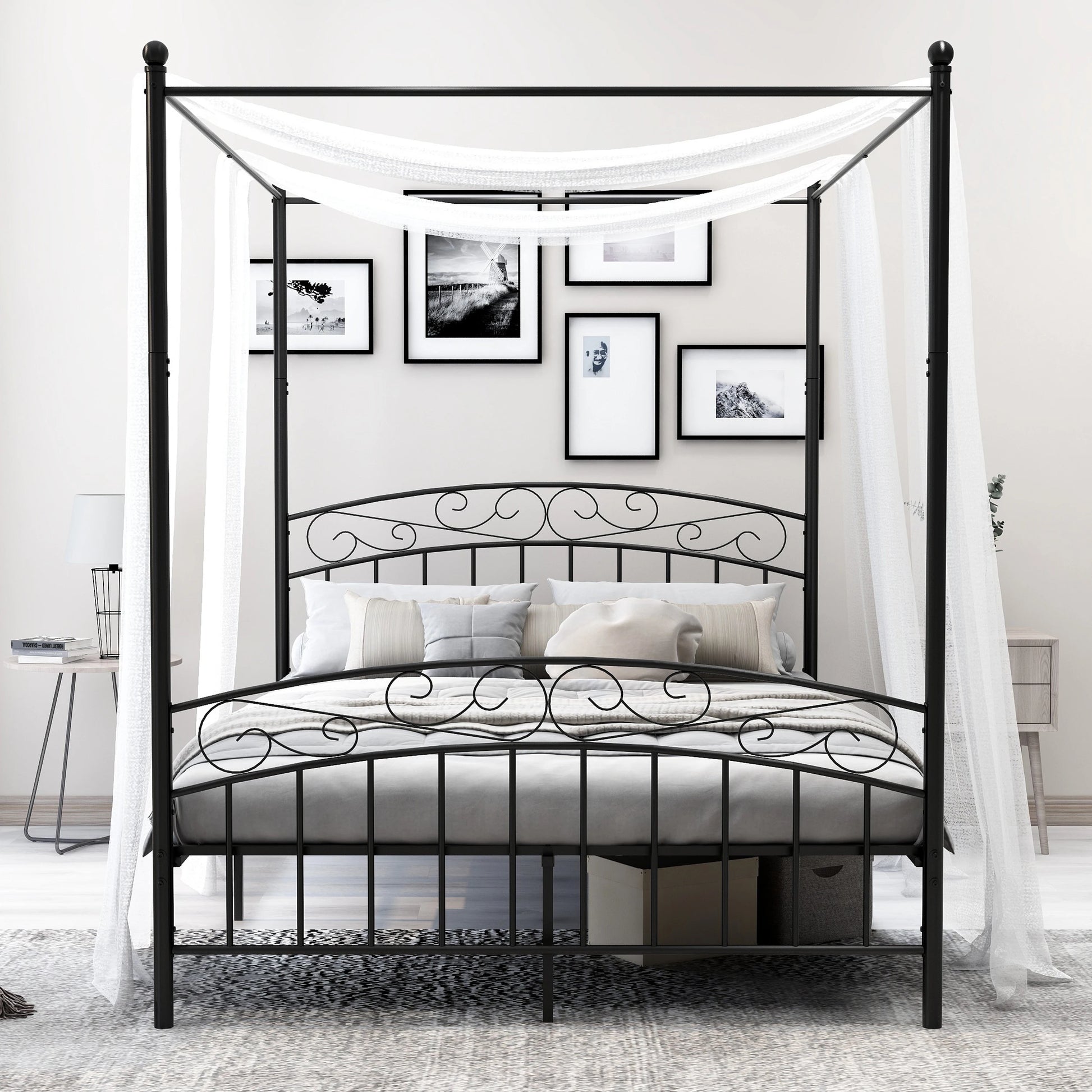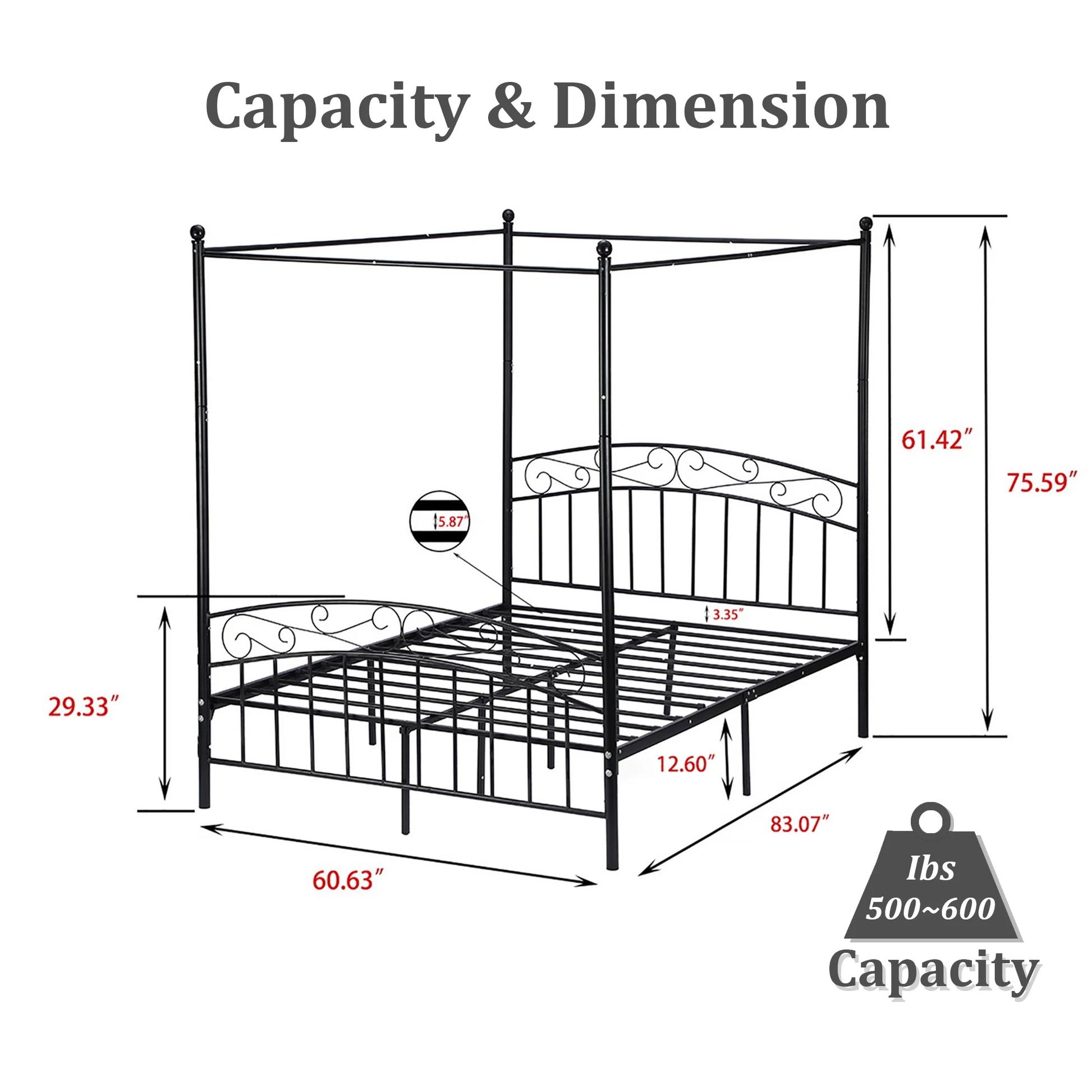 1.Romantic and Stylish: This metal canopy bed frame show cases clean lines and four canopy posts, bringing a romantic and inviting feeling to your bedroom. You can hang your wonderful decor on the sturdy frame.