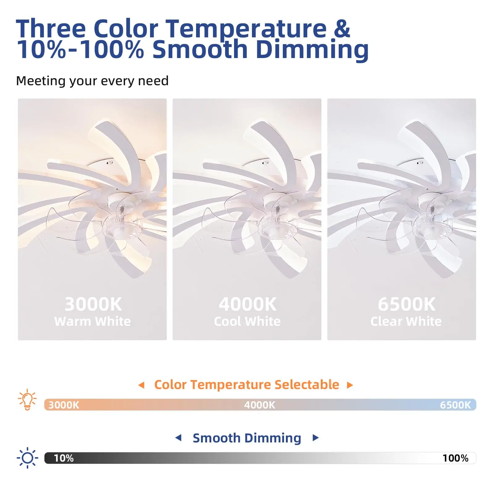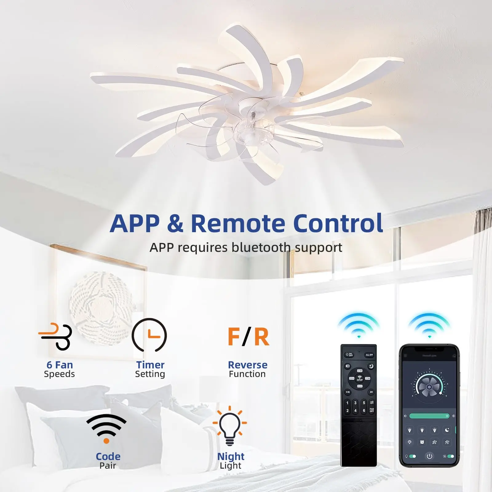 Ceiling fan with remote for APP: Low profile ceiling fan has a reverse function , 6 wind speeds,1/2/4h timing,and all the functions can be operated by the hand-held remote or APP.The fan or illumination can be turned on separately