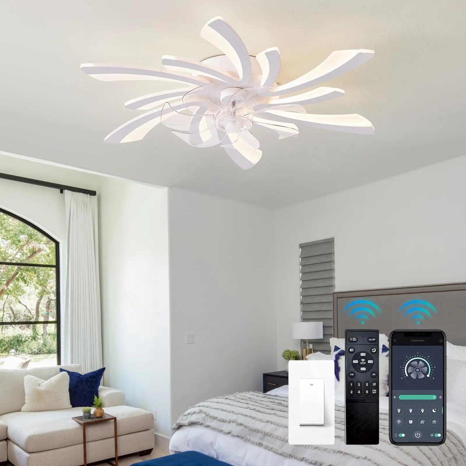 Ceiling fan with light, modern dimmable flower shaped ceiling fan, with remote control/app control, timed fan ceiling light