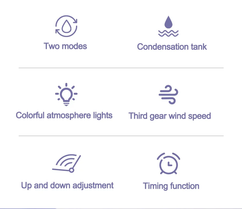 6. The colorful automatic changing atmosphere light of the upper water tank can be opened/closed separately; the lower water tank is a condensate tank, and it can be drained manually if it is full of water;