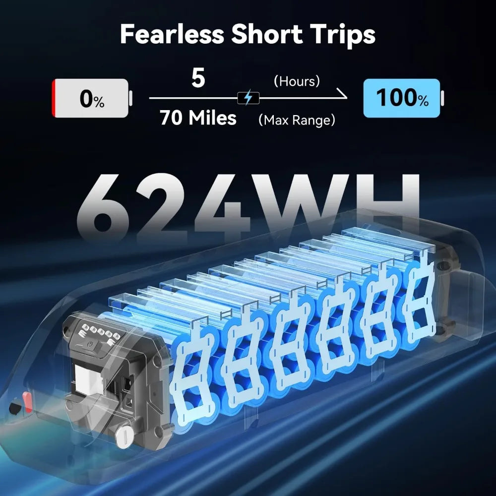 - 【Removable Large Capacity Battery to Limitless Exploration】The fat tire electric bike comes with 48V 13Ah battery, IPX6 waterproof, quickly removable and easy to carry. Two charging ways, ① removing the battery to charge. ② direct charging on the bike. Easy to charge your e-bike at home or at work. With a fast charging adapter, this pedal assist electric bike offers up to 70 miles of travel (PAS mode) on a single charge (4 hours). Long-distance commuting is no longer a challenge.