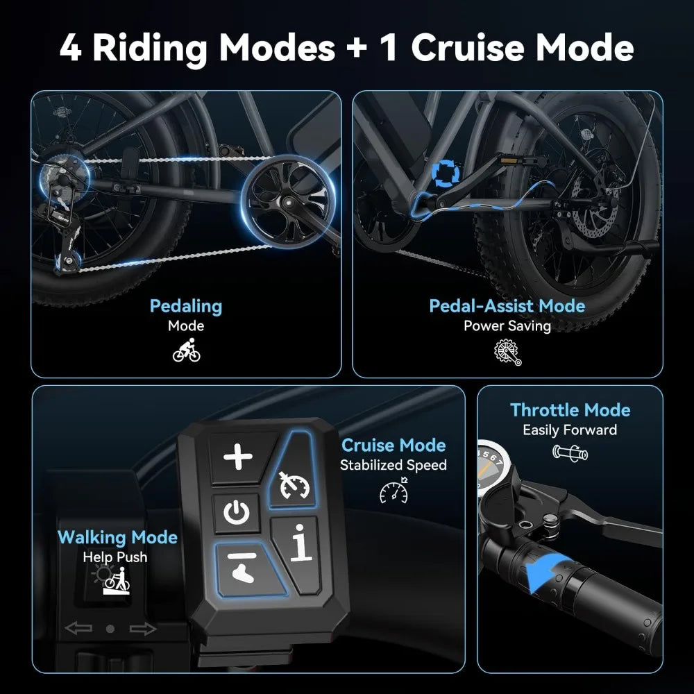 - 【Safety & Stability for Exceptional Riding Experience】The full front & rear suspension system of this fat tire ebike, combined with 20"x 4" anti-stab snow fat tires, absorbs most of the bumps and vibrations during riding. Whether bumpy terrain or city streets, e bike ensures comfort and stability.The front & rear dual mechanical disc braking system can provide powerful braking capabilities and precise instant braking speed even on slippery roads, ensuring your safety at all times.