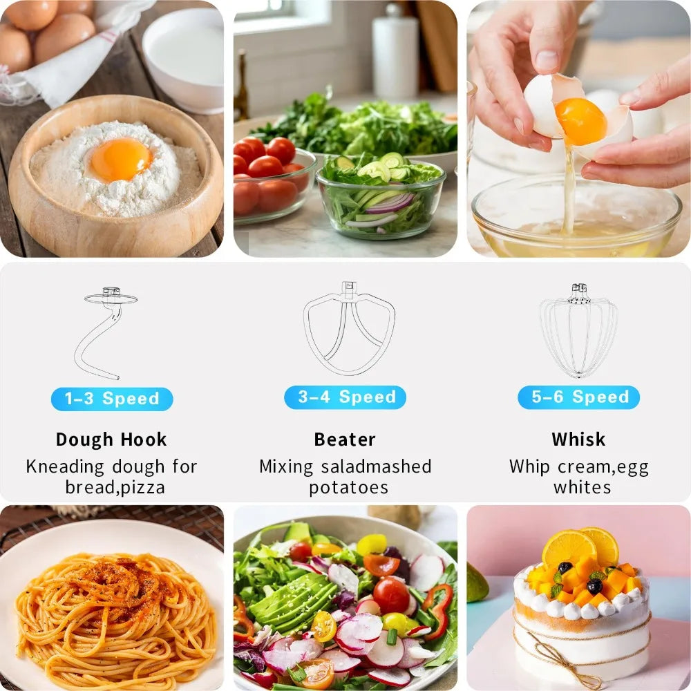 【Reliable Quality & Dishwater Safe】-Standing mixer has been approved with FCC, ROSH, and other certifications. The overheating protection function of the cake electric mixer can make you feel at ease when baking. Clean-up is simple with a kitchen mixer, As for the bowls and attachments you can either wash them in the sink or safely put them in the dishwasher.