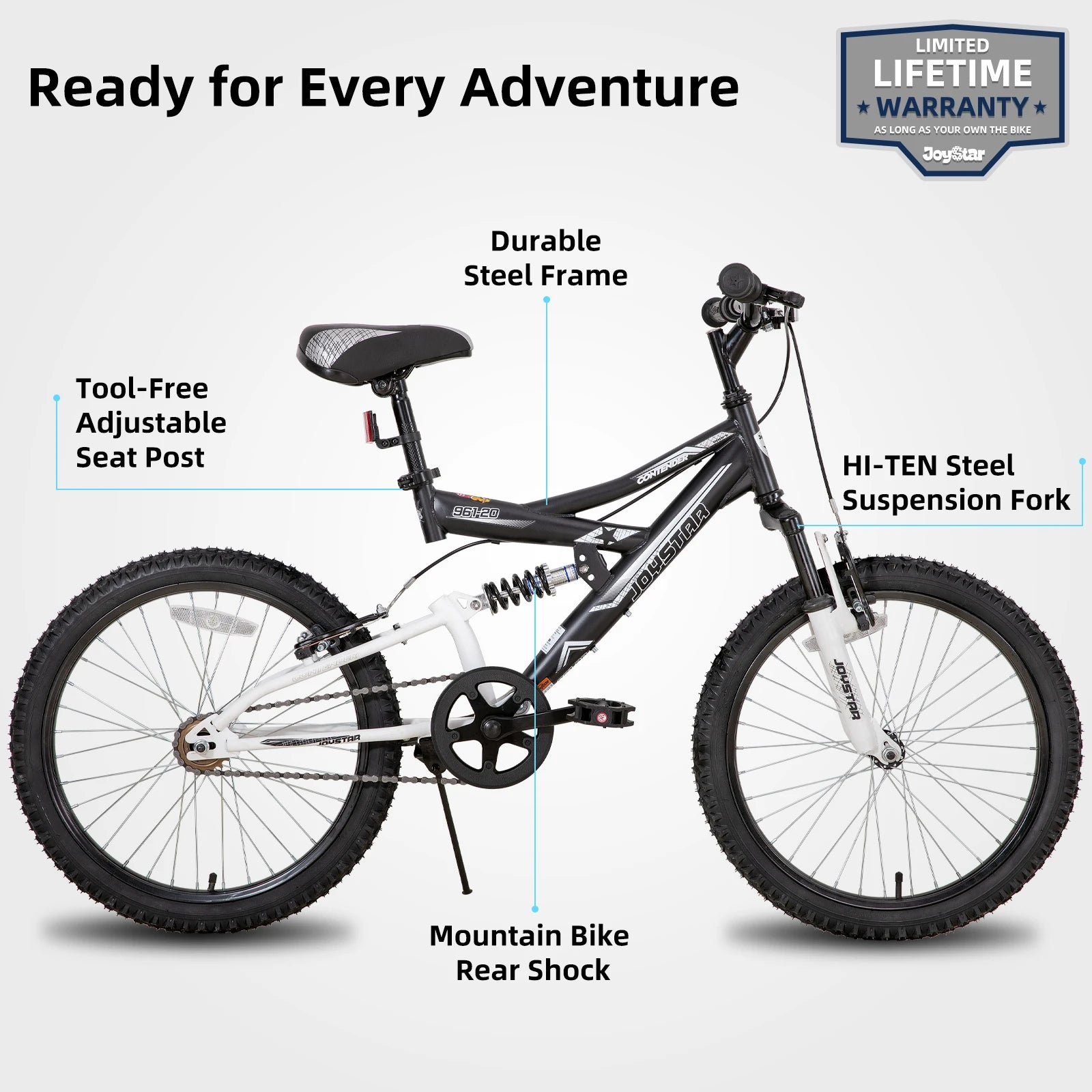 JOYSTAR Contender 20inch Kids Mountain Bike is an authentic mountain bike that also happens to be a 20 inch kids' bike. The designers of the Contender didn't hold back even a bit while selecting components. The result is the epitome of children's mountain bikes.