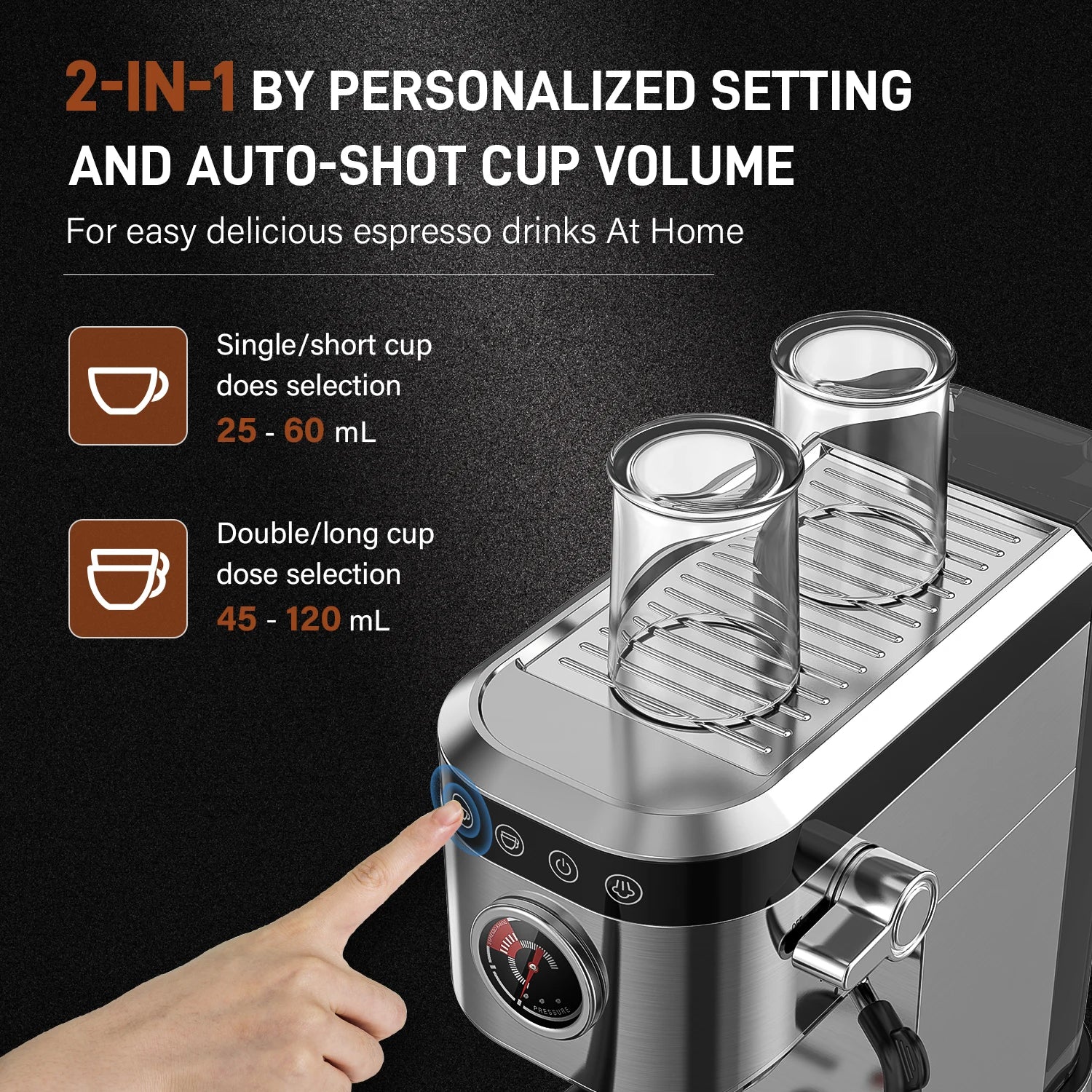 2.Professional 20 Bar Pressure System: Semi-Automatic 2-in-1 Espresso Maker, with 20 bar professional Italian pump and 1350 W powerful boiler. This latte machine gives you top quality extraction, resulting in a more fragrant and rich aroma. The built-in pressure gauge on this cappuccino machine shows the exact pressure helping you make adjustments according to your personal taste preferences. You can create a cappuccino, latte or flat white at your home or office with our cappuccino maker.