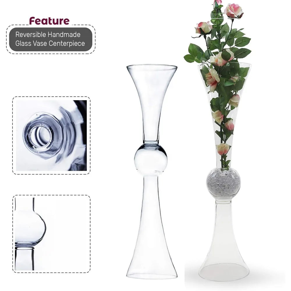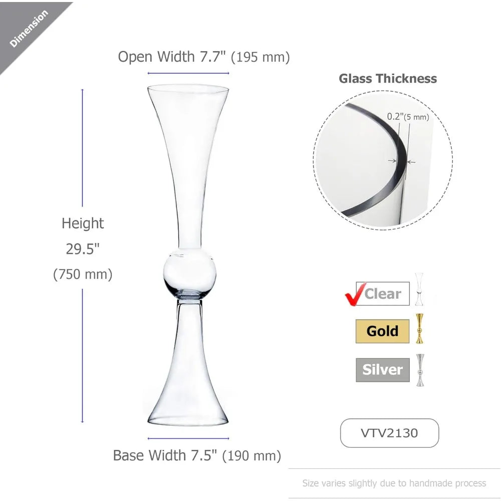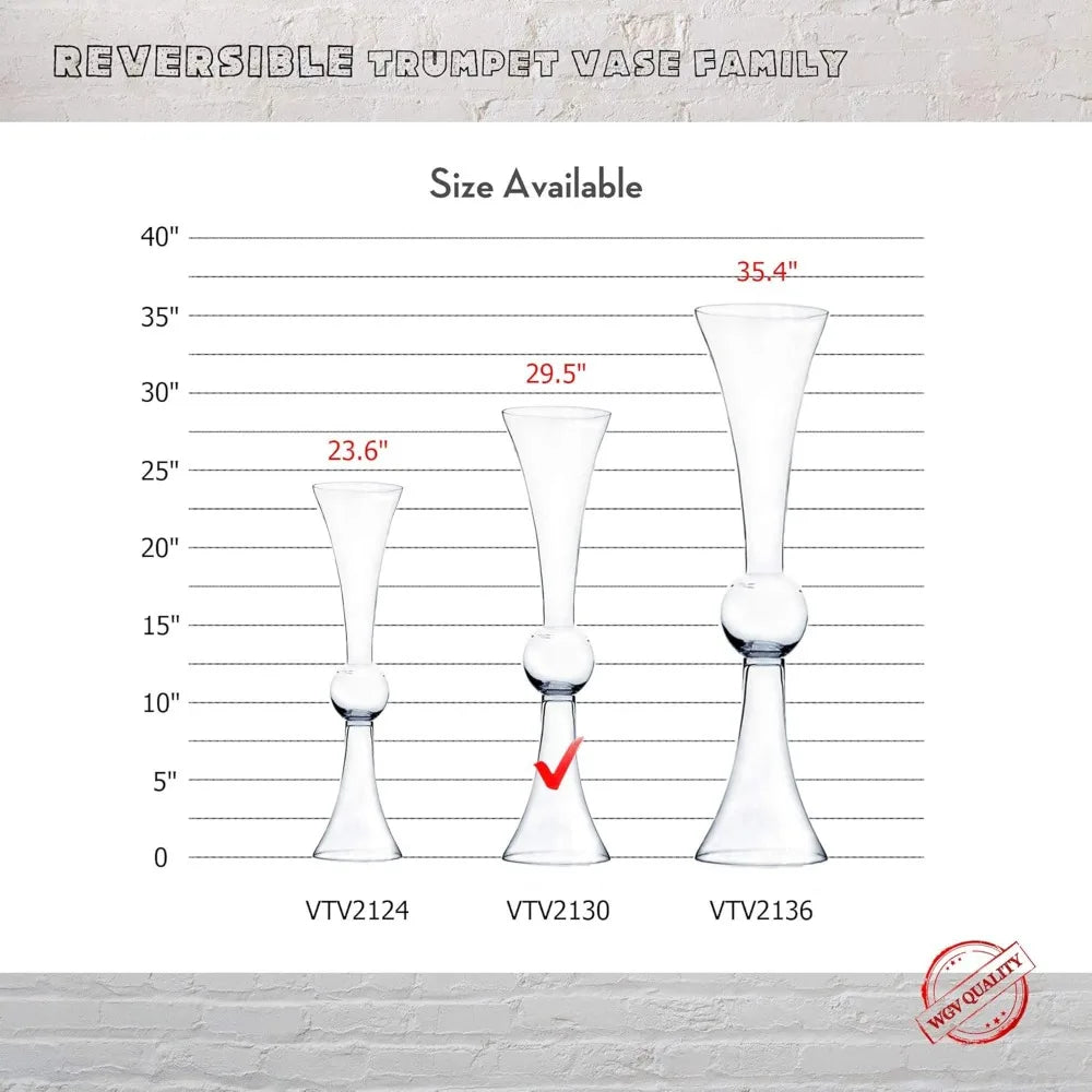 Tall Trumpet Vase Bulk, Open 7.5", Height 30", Base 7.5", (Multiple Size/Color Choices) Clear Reversible Latour Floral Wedding